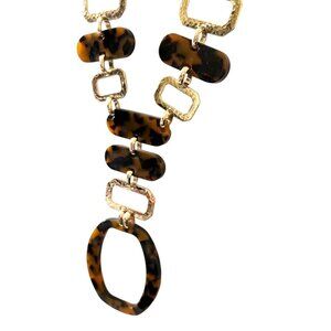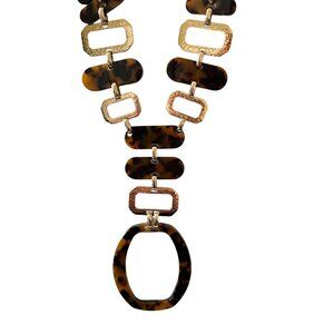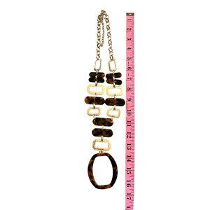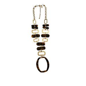 Elevate your style with this stunning Chicos statement necklace featuring tortoise shell and goldtone links. Ideal for adding a touch of sophistication.