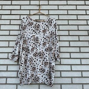 Chico’s Touch of Cool tunic in a chic leopard animal print, crafted in their signature lightweight rayon blend designed to keep you cool and comfortable. Features a relaxed wedge silhouette with 3/4 sleeves and a flattering bateau neckline. Tunic length offers versatile styling—wear with leggings, jeans, or trousers for work, travel, or casual days. Neutral cream background with pops of black and brown animal print for a bold yet classic look. Fabric: 95% rayon, 5% spandex. Size 3 (fits like an XL). Excellent used condition.