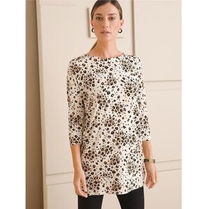 Chico’s, Touch of Cool, wedge tunic, leopard print, animal print, cheetah print, neutral top, cream blouse, longline tunic, 3/4 sleeve top, bateau neckline, relaxed fit, stretchy top, fall layering, comfy chic, travel wardrobe, career wear, bold neutral, soft rayon blend, classic animal print, boho glam, cozycore, tradcore, retro chic
