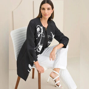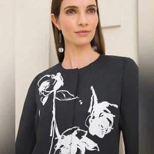 Abstract floral designs create a monochromatic work of art on the front of this rose-print topper. This dressy outer layer is just the thing for spring events and evenings out, giving you the lightweight warmth you need with dramatic style you love. The crossover sleeves are shaped by a fold at the cuff, beautifully finished with a polished metal button.