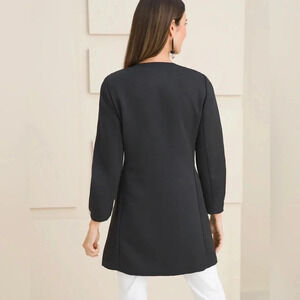 Classic fit with long sleeves, front pockets, concealed zipper closure with snaps and jewel neckline.