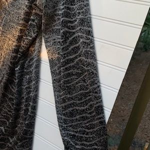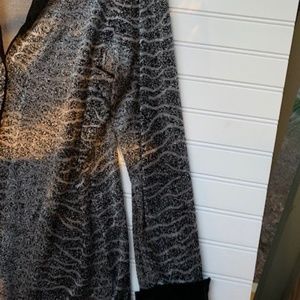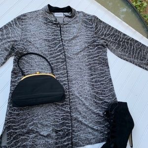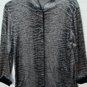 Great addition to your travel wardrobe. No need to iron. Black and silver. Change the look by buttoning the jacket so it will be primarily black and silver. Unbutton to show faux velvet trim. Cuffs fold up reveal faux black velvet or fold down to show black/ silver. Pair with black skirt, jeans, leggings or dress. Change look with jewelry, shoes or purse. Size 2. Shoulder to bottom hem : 26" approx . Chest front pit to pit 18" approx Shoulder to Arm cuff: 21"approx W-207 K