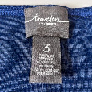 Gorgeous 3/4 sleeve navy blue tunic top from Chico's Travelers line features a squared off neckline