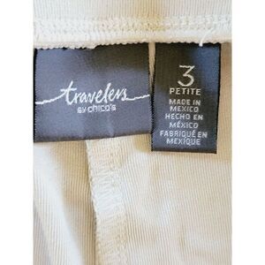 Elevate your wardrobe with these stylish Chico's Travelers 3P pants. Featuring a pull-on design and a comfortable elastic waist, these dress pants are perfect for both travel and casual occasions. The pants are made of a stretchy knit fabric that ensures a perfect fit and accentuates your curves, while the solid beige color adds a touch of sophistication to your outfit.