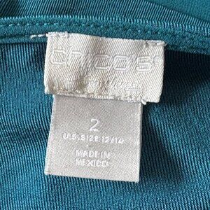 This Chico's Travelers teal tunic features a luxurious upper and a sheer hemline, offering an elegant and versatile wardrobe addition for sophisticated styling.