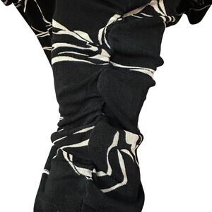 Chico's Travelers, Black beige abstract floral print, Long sleeve tunic, Scoop neckline, Side ruching hem detail, Stretch acetate spandex blend, Travel wardrobe essential, Wrinkle resistant top, Comfortable chic blouse, Office to evening wear, Minimalist modern style, Career casual tunic, Artsy floral statement piece, Classic Chico's style, Made in Guatemala, Machine washable, Approximate length 29", Approximate pit to pit 23"