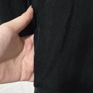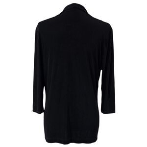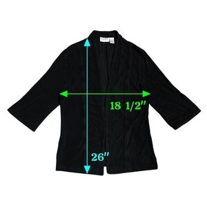 Size Chico's 1 which is size 8. Good used condition, with no stains or tears. A black 3/4 sleeve open front cardigan, with side pockets. The slinky knit material is stretchy and wrinkle resistant.