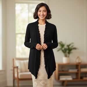 This is made by Chico’s for their Travelers line. It’s a black long sleeve cardigan with a ruffle front. Chico’s size 3 (XL) and in wonderful pre owned condition. Smoke and pet free home.