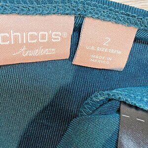 The Chico's Travelers Blouse is a stylish and versatile top perfect for a variety of occasions. Made with a blend of spandex and acetate, this blouse features a v-neckline, 3/4 sleeves, and a pullover closure for easy wear. The teal blue-green color adds a pop of vibrancy to your outfit, while the ribbed and 7-sided neckline accents give it a unique touch. Ideal for travel, parties, or casual outings, this relaxed-fit tunic is a must-have for your wardrobe. Condition: Good but some crushed areas in fabric. Flaws: The acetate reflects light differently than cotton/rayon fabrics. when laid flat, it shows an area of white sheen . But when vertical, it does not show, due to th light. Also the top can appear more blue in cool light and more teql green in warm light. Measurements: 21" armpit to armpit and 28" length. Please verify these are larger than your own to ensure it fits. Dress form is a size 18 with a 45" bust. Note: This sale is final unless product does not match the description.