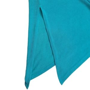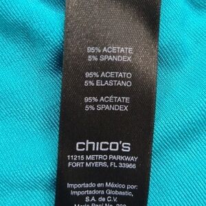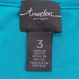 Size Chico's 3 which is size 16. Good used condition, with no stains or tears. A bold blue 3/4 sleeve tunic, with an asymmetrical hem. Has a round neck and large side slit. The slinky knit material is stretchy and wrinkle resistant.