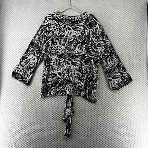 Keywords: Chico's, Travelers, Abstract Print, Tie-Front Top, Blouse, Bell Sleeve, Black and White, Womens Top, Size 3, Acetate, Easy Care, Statement Top