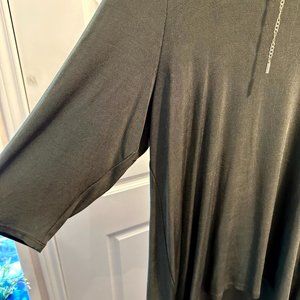 Gold-tone chain detail dresses up the neckline of this casual, comfortable, and ready to travel top! A high-low hemline and ¾-sleeves complete the look. Made from 95% acetate and 5% spandex, this olive color blouse packs well and is wrinkle-resistant.