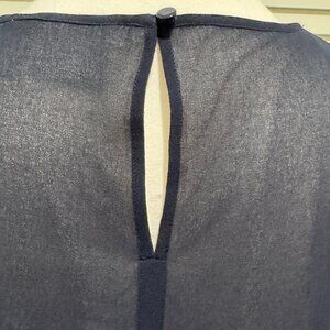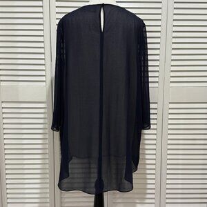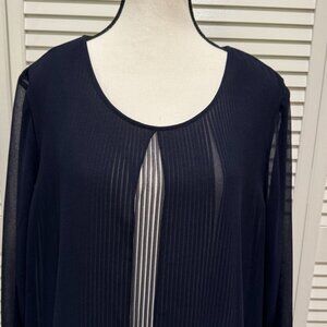 This is a beautiful and unique blouse from Chico’s Travelers Collection, designed with an elegant layered look. The sheer navy overlay features a flowing silhouette with a pleated panel insert in the front, creating movement and sophistication. Perfect for work, travel, or an evening out.