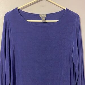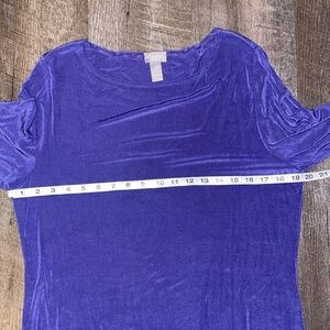 Chico’s Travelers Collection Slinky Purple Asymmetrical Tunic Top size 2 (L/12). Very good preowned condition. Travel throw in suitcase and won’t wrinkle is the premise of this collection. Split up longer side of top. Little shine to fabric. Can look different colors in different lighting but I’d call it a Ube purple color. See pictures for approximate measurements. Has a lot of stretch.