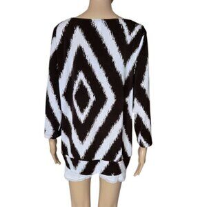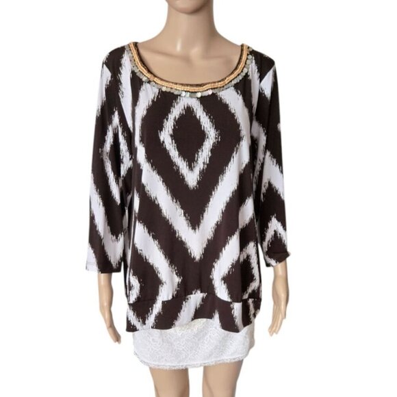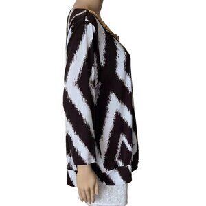 Chico's Travelers Dark Brown White Angled Striped Beaded Neck Top.