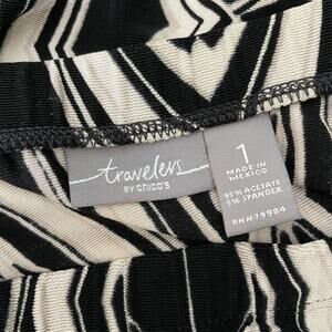 Elevate your wardrobe with this artsy and stylish Chico's Travelers skirt. The black and ivory geometric pattern adds a touch of class to any outfit. Designed for comfort and style, this skirt features an elastic waistband for a flexible fit. Perfect for a sophisticated yet relaxed look.
