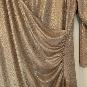 Beautiful gold cheetah surplice top. Long sleeves and shirred side with an asemetric hem make this the perfect holiday top! Very flattering!!