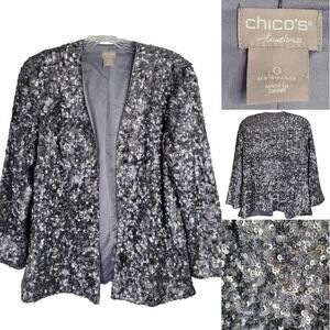 Chicos Travelers Jacket Cardigan Womens Size 4/6 Gray Silver Open Front Sequins