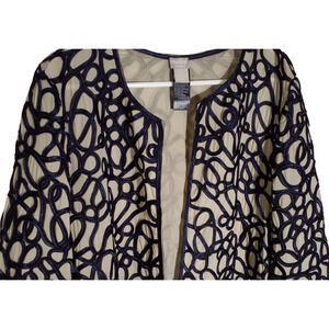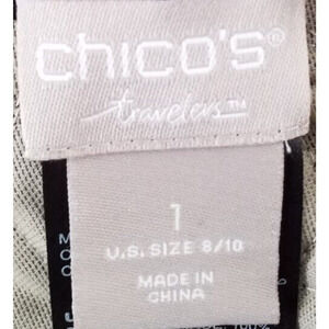 Chicos Travelers Jacket Tan Black Swirl Stripe Hook Eye Sz 1 M Stretch