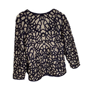 Preowned Chico’s Travelers Collection swirl stripe jacket in tan and black. Hook-and-eye closure, stretchy wrinkle-free fabric. Flattering, comfortable, and perfect for travel or workwear.