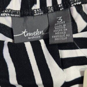 Size Chico's 3 Short which is size 16 Petite. New with tag. Black and white abstract swirl pull on pants. Has slinky knit material, which is stretchy and wrinkle resistant.