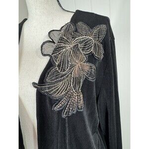 This Chicos Travelers jacket in size 2 Marissa features a stylish floral embroidered appliqué design, making it perfect for travel. The mid-length jacket has long sleeves and an open front, ideal for cooler weather. Made with a blend of acetate and spandex, this black jacket offers a comfortable and versatile option for any occasion. The artsy and colorful theme adds a unique touch to this classic basic jacket from Chico's.