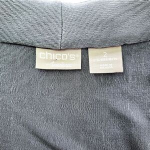 Chico's Travelers slinky cardigan. Made with a travel friendly wrinkle resistant fabric. This cardigan is pack & go. Take it out of your suitcase, put it on and the wrinkles will just fall away. The color is glacier blue with is a muted grey/blue color. Just enough of a pop of color to add interest to your outfit but versatile enough to match with different pieces. This is open front style with a long line silhouette in an asymmetric cut. This is in very good pre-owned condition. Chico's size 2 which is a regular size L/12.