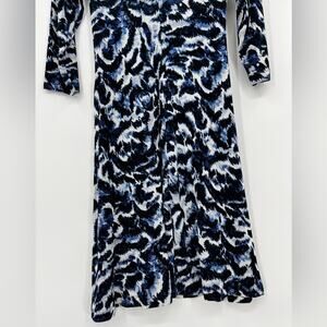 Chico’s Travelers Printed Faux Wrap Midi Dress 3/4 Sleeve Stretch V Neck Twist Animal Print Comfort Navy Blue White Size Medium