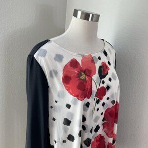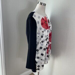 Chicos Travelers Shirt Womens 2 Black White Red Floral Dot Long Sleeve Tunic Top