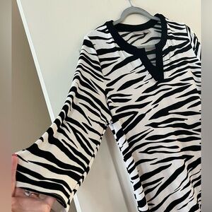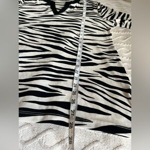 EUC excellent condition & quality! Beautiful mixed blend fabric. Black & white zebra pattern, black lined detailed neckline. Measurements in photos. Chico’s conversion chart in photos. Chico’s size 2. Women’s size large. Smoke free home