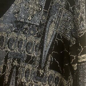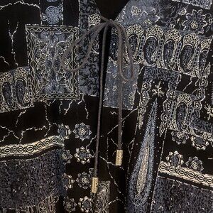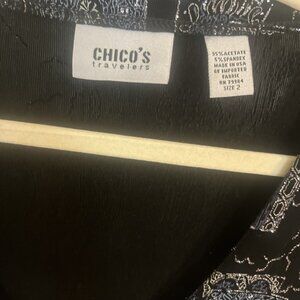 Elevate your wardrobe with this stunning black metallic jacket from Chico's. Featuring a glittery finish and chic tie closure, this jacket is perfect for any occasion. Designed for elegance and comfort, it’s a must-have addition to your collection.