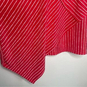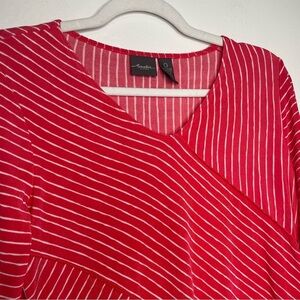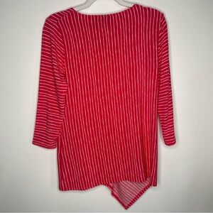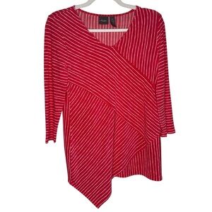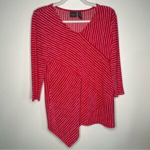 Chico’s Travelers Tunic 3/4 Sleeve Red Coral Striped V-Neck Asymmetrical Hem 0/S