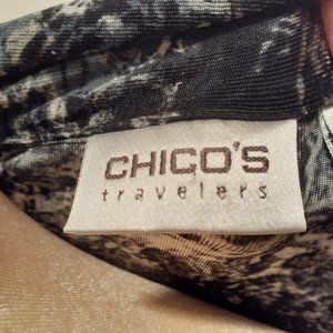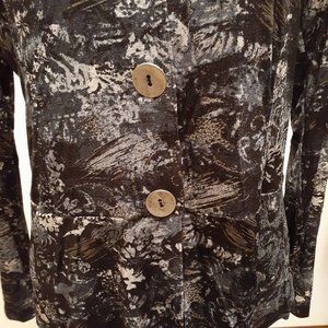 ▪️Description: Chico's Travelers Twilight Shadows Gwendolyn Women's Jacket or Blazer. It has a gorgeous black, gray and sage green swirly design and 3 silver button down the front. It has some stretch to it and is very soft and comfortable. The jacket could also be worn open with a top under it.