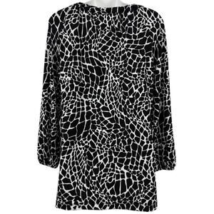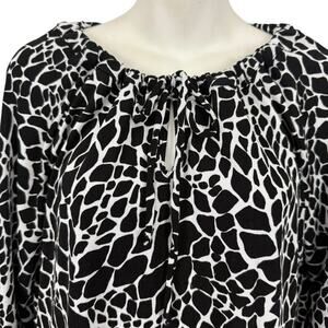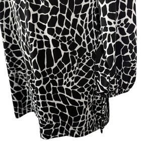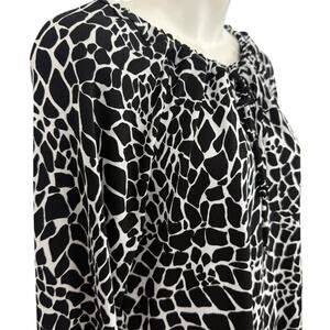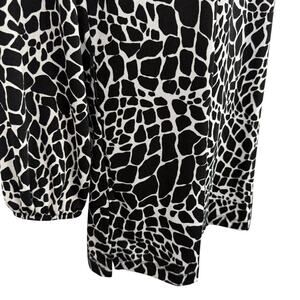 This Chico's Travelers Women's Slinky Liquid Knit Animal Print Long Sleeve Top in size M is a versatile and stylish piece perfect for travel, casual outings, or business meetings. Made from a comfortable polyester and spandex blend, the top features a round neckline, wide straps, and balloon sleeves for a unique and fashionable look. The black animal print adds a trendy touch to the blouse, which is easy to care for with its machine washable fabric. Perfect for the winter, fall, or spring seasons, this top is a must-have addition to any woman's wardrobe.