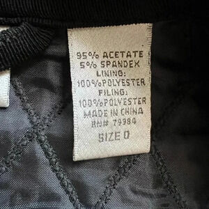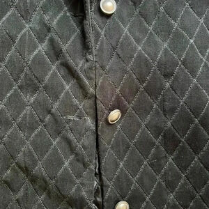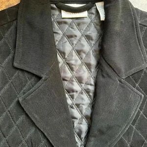 Chico’s Travelers black woman’s jacket. Chicos size: 0/S, 4/6. Soft, stretchy, non-wrinkle material. Long sleeves. Slit, side pockets. Diamond print. Satin lined. 3 metal button front closure. Length: 27” PIT2PIT: 20”. Like new.