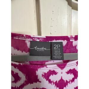 Chico’s Travelers size 2P or medium petite dress. Slinky material. Pink and white with some purple around the bottom. Great condition with no signs of wear. Measures 20” from armpit to armpit. 21” across the waist and it is 40” long.