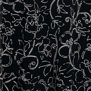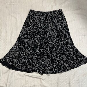 Chico's Traveler's skirt in size 2. Black and white sketched floral design. Elastic waist, flowy, stretchy material with lots of swing. 95% acetate, 5% spandex. A-line.