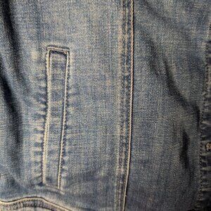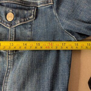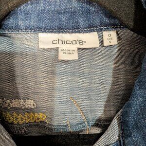 The Chico's Embroidered Relaxed Denim Jacket in size small is a stylish and comfortable outerwear option for women. Made from a cotton blend, this short-length jacket features a floral pattern and intricate embroidery accents. Perfect for casual or travel occasions in the fall and spring seasons, this blue jacket has a collared neckline, button closure, and pockets for added functionality. With a relaxed fit and a chic bohemian style, this basic jacket from Chico's is a versatile and fashionable piece for any wardrobe.
