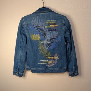 Chico's Tropical Embroidered Denim Jacket Small Blue Floral Boho Jean Coat