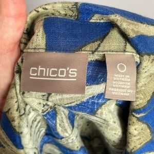Chico’s Tropical Floral Linen Button Front Tahiti Shacket Shirt Jacket size 0 (S/4). Very good preowned condition. Blue buttons on front. 1/2 to 3/4 sleeve. See pictures for measurements. Pockets on front. Band hem not elastic. Gorgeous bright blue color with tropical foliage and flowers. Vacation. Office. Travel. Casual.