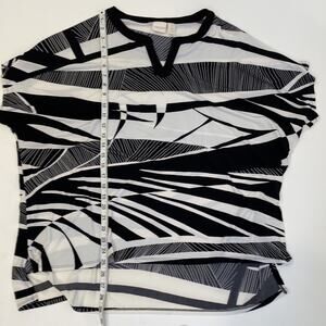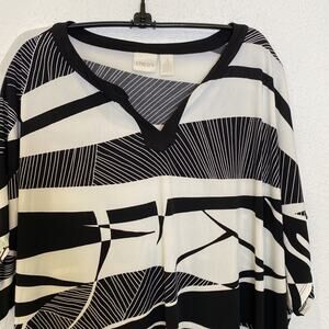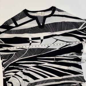 Polyester spandex abstract Chico’s tropical contrasting botanical black white women’s short sleeve split neck relaxed body plus size plus sized plussize plussized plus-size plus-sized high low knit