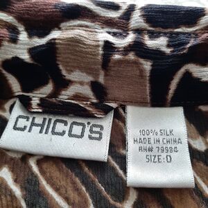 Chico’s Geometric Print 100% Silk Button Down Tunic Top 0 4 XS black Art to Wear.