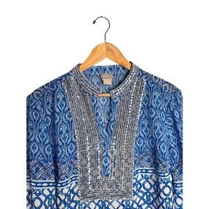 Chico’s Tunic Seaside Sheer Rhinestones Size 12P Blue White Black Blouse Beach