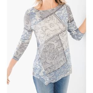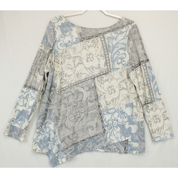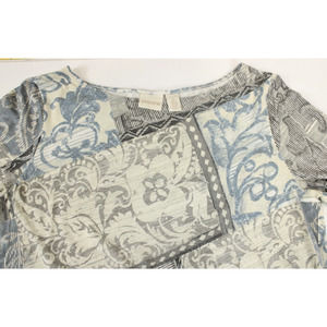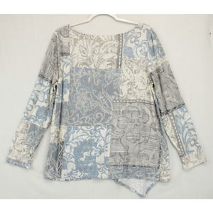 Chico's Size 2 Tunic Top Women L / 12 Asymmetrical Hem Multi Pattern Scrolls & Floral Cream Blue Long Sleeve