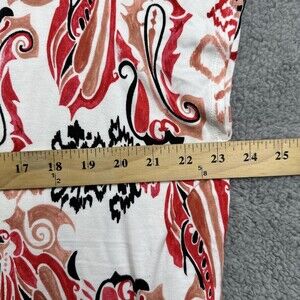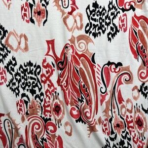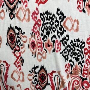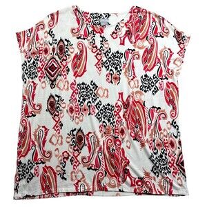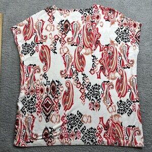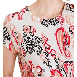Vibrant paisley ikat print in white, black, and red. Soft, lightweight knit with comfortable stretch. Designed with cap sleeves, a round neckline, and a relaxed fit.