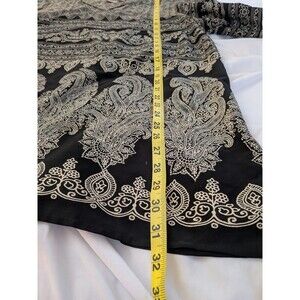 The Chico's Tunic Women's XL/3 Paisley Black Tan Floral V-Neck Blouse Top is a stylish and comfortable boho flowy top perfect for casual occasions. Made of lightweight polyester chiffon, this blouse features a flattering V-neckline and balloon sleeves, adding a touch of bohemian flair to your outfit. The black and tan paisley pattern gives it a trendy and versatile look that can be worn year-round. Easy to care for with machine washable instructions, this tunic is a great addition to any woman's wardrobe.
