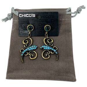 Whimsical and bold, these Chico’s turquoise lizard drop earrings feature a bronze-tone scroll design accented with turquoise-colored stones and dark teal glass studs. Approx. 2.25 inches long.