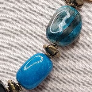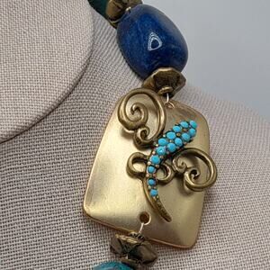 *Description: This is a Chico's side pendant, beaded necklace with turquoise blue beads in gemstone, acrylic, and glass with a 2 1/2 Inch chain tassel with beads on the end. The pendant on the side is signed CHICO'S on the back and there is also the hanging Chico's tag near the lobster clasp. The necklace looks really good. I measured the gemstone beads on my Presidium Gem Tester. This would be a great addition to your jewelry collection or make a great gift!