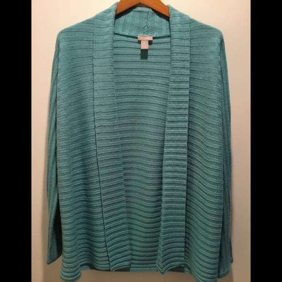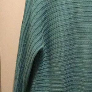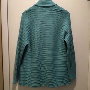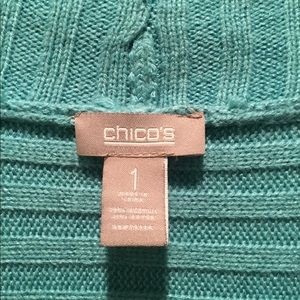 Lovely Chico’s turquoise sweater. Gorgeous color. Stylish, cozy and warm. Chico’s Size 1 or Medium. Horizontal ribbed pattern.