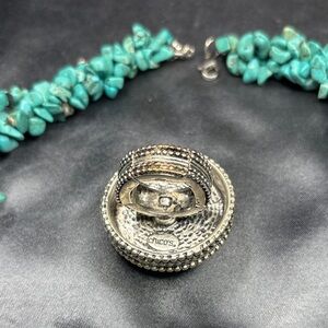 Chico's necklace and ring set featuring vibrant turquoise stones. Perfect for a bold statement. Very pretty costume jewelry the ring has a stretch band.